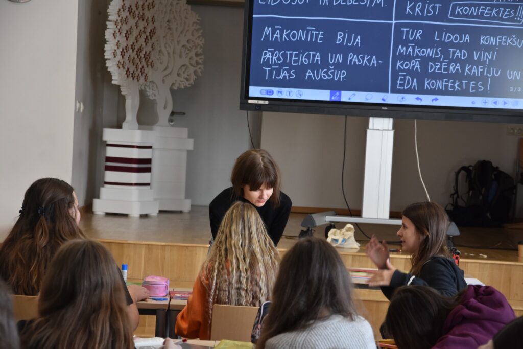 “Mums vienmēr ir arī ievadstundas – kur mēs iesim, kāpēc? Piemēram, arī komiksu darbnīcu gadījumā mēs jau stundās, Dzejas dienas ietvaros, lasījām dzejoļus un centāmies tos uzzīmēt komiksā, lai vispār saprastu, kas tas komikss tāds ir? Runājām arī par komiksu kā žanru. Un tad ar skolēniem vienojāmies, ka viņi savus darbiņus ņems līdzi uz komiksu darbnīcu ar māksliniekiem un uzzinās, cik veiksmīgs viņu pirmais mēģinājums ir bijis.”