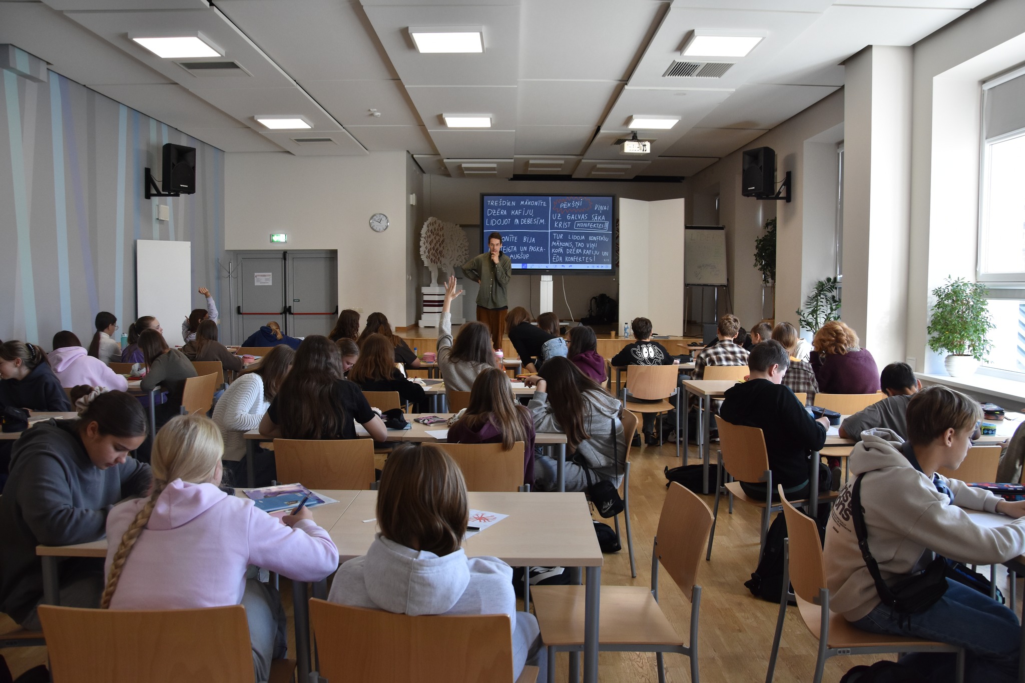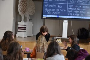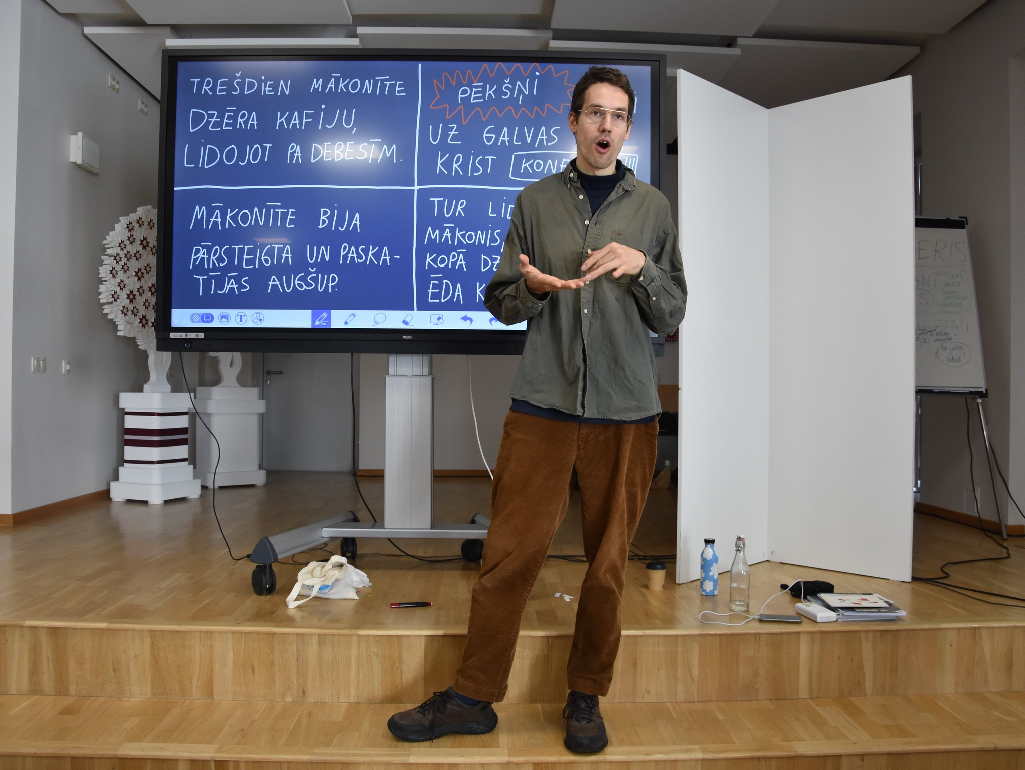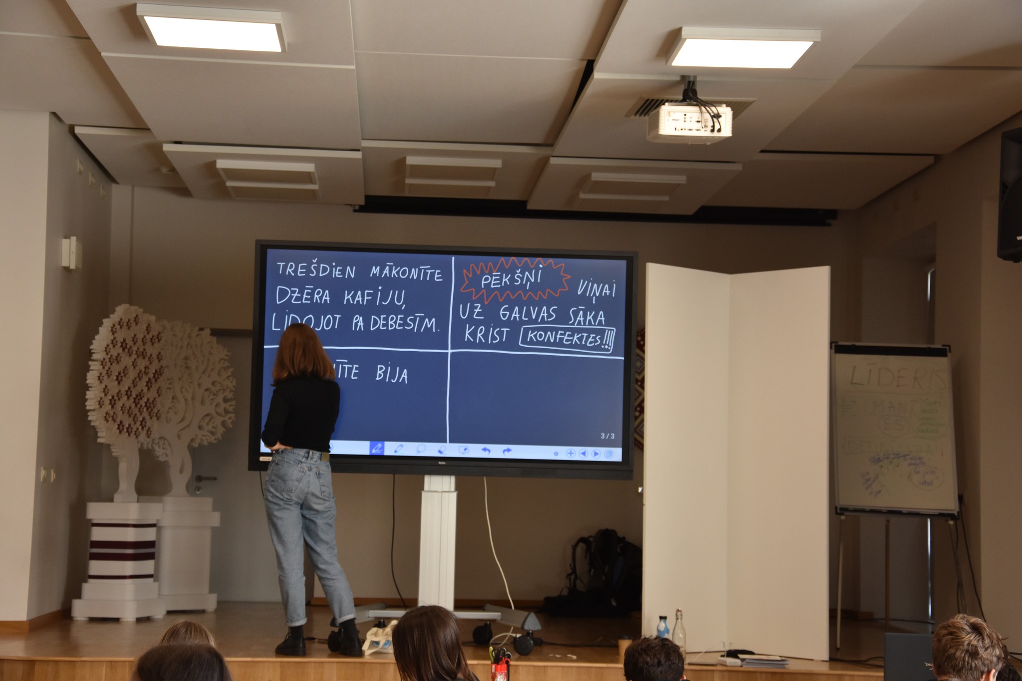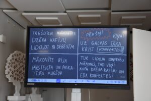 - Leons: “Ļoti patika Lotes zīmējumi uz tāfeles. Visvairāk patika tieši vadītāju sadarbība ar auditoriju.”